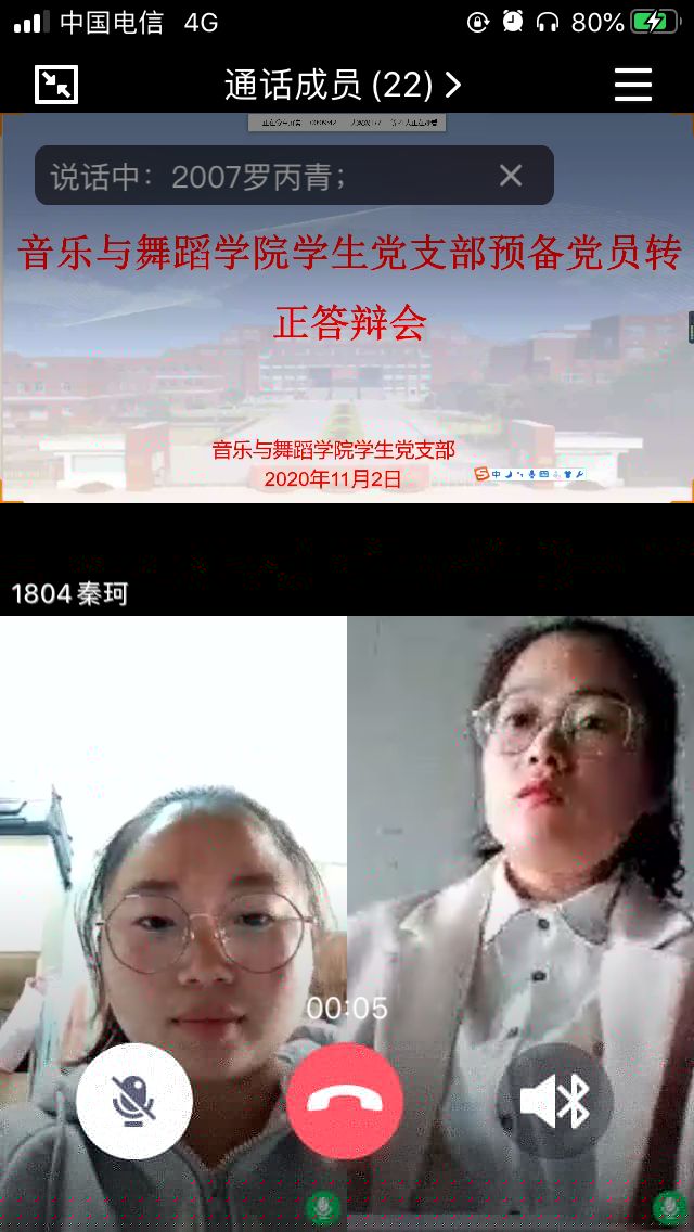 2020年11月2日12:50,菠菜担保论坛大全學生黨支部,召開了關于2007班王藝蓉、羅丙青同志預備黨員轉正答辯線上會議 。本次會議由學生黨支部書記徐慧娟老師主持召開,支部全體成員參加了此次會議。