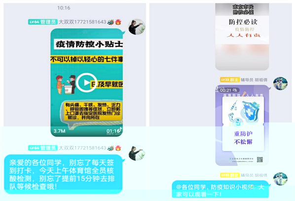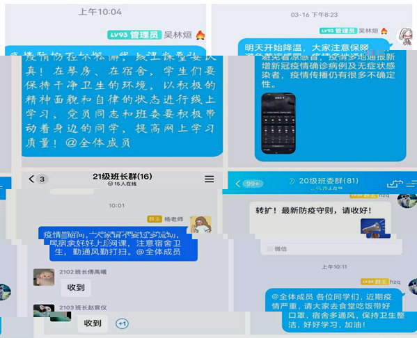 抗擊疫情,學工隊伍堅守崗位。線上教學期間,全體輔導員做好學生線上學習的監督工作,高質量的配合好教師的線上教學工作;關注學生日常生活,以及宿舍衛生情況;輔導員監督學生日常健康打卡,确保每日健康打卡全部完成;配合好學工處,在規定時間安排學生核酸檢測,确保多輪核酸檢測順利進行;加強疫情期間的思政教育,在班級QQ群裡分享正确認識新冠病毒,如何做好防疫以及加強身心健康建設等相關知識;定期檢查學生宿舍學習情況以及宿舍衛生。積極督促學生做好線上學習,同時要與宿管阿姨做好配合,确保學生在校期間無特殊情況不離校、不離甯。