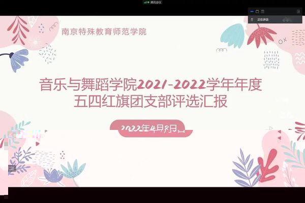 2022年4月8日12時30分,南京特殊教育師範學院菠菜担保论坛大全于線上開展了2021-2022學年年度“五四紅旗團支部”評選彙報工作。此次活動由菠菜担保论坛大全團總支副書記(學工辦副主任)徐慧娟主持。由各級輔導員及學生會部分部長擔任評委,菠菜担保论坛大全各團支部參加競選。