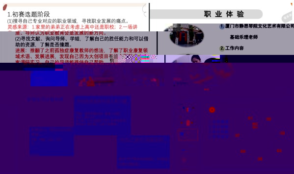 第四位分享者是來自菠菜担保论坛大全2004班的劉沣誼(曾獲校級第五屆大學生職業生涯規劃大賽第一名)。他說“興趣是最大的老師”。應該要認識到沒有生涯規劃的嚴重性,有了規劃就有了目标,目标也應該具有實際性。職業生涯=知己+知彼,職業就是在不斷探索中,不斷得失,豐富自己,提升自己。