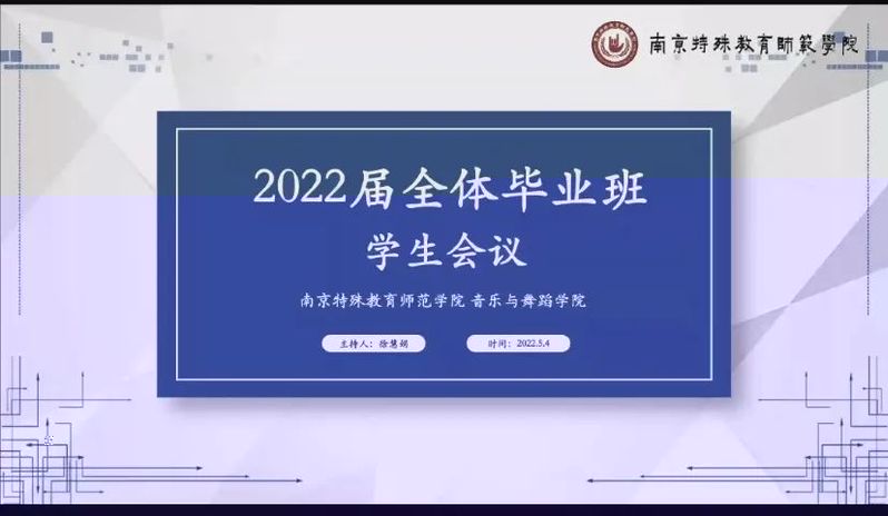 2022年5月4日下午15:00,南京特殊教育師範學院菠菜担保论坛大全2022屆全體畢業班學生會議于線上準時召開。本次會議由團總支副書記徐慧娟老師主持,參與會議的有菠菜担保论坛大全黨總支副書記黃珏老師、李媛媛老師、李小婷老師、朱玉曉老師和王陽光老師。