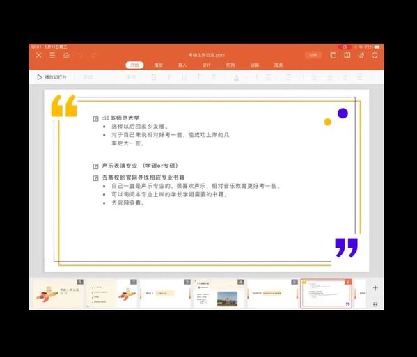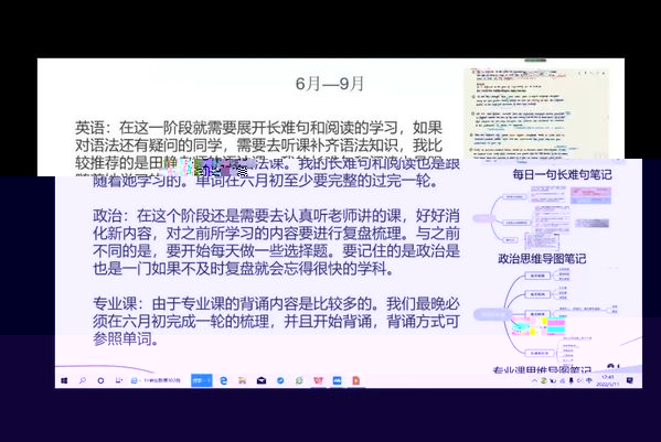 其次,1801班的江雯同學分享了她的考研經曆。她就考研的初試和複試兩個階段進行了詳細的說明,分享了每一個階段應該學什麼,怎麼學以及如何學。如在備考初期,背單詞是重中之重,江雯同學分享了如何背單詞才能背的牢固徹底。學習政治時,應認真聽老師講課,做思維導圖等學習方法,為同學們提供了學習的思路,明确了學習道路。發言的最後,江雯同學分享了她的考研心得,她表示,堅定的決心,每天學習的習慣,超強的執行力和良好的心态缺一不可。給自己的靈魂減負,去做想做的人,想做的事,成為自己想成為的人,無論結果如何,隻要努力過,就是青春最好的答卷。