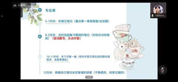 此次會議特别邀請了成功上岸的五位優秀畢業生:1801班王來燕(南京師範大學音樂教育理論研究專業),1801班江雯(南京師範大學中國傳統音樂理論研究專業),1802班盧萍(江蘇師範大學聲樂表演專業),1804班孫美奇(四川師範大學音樂教育專業),2007班王藝蓉(南京師範大學音樂教育專業)。她們結合自己的考研經曆詳細的給同學們講解和分享了讀研的必要以及備考期間應注意的問題,包括考研各科的複習方法、考研信心的樹立、考研計劃、備考心态的調整、生活飲食習慣、作息時間安排,以及有關選擇專業方向和複試等方面的一些心得。