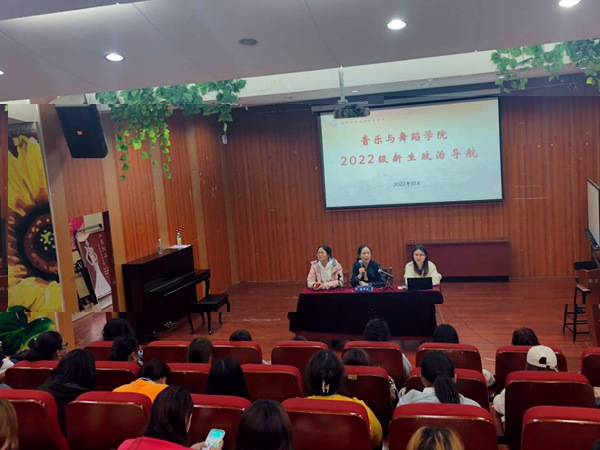 為了使新生更快更好地融入菠菜担保论坛大全,提高政治素養,音舞學院于2022年10月11日晚上在110音樂廳開啟新生政治導航。參會人員有黨總支書記蔣科星、團總支副書記(學工辦副主任)徐慧娟、學生黨支部書記胡祖倩以及22級全體新生。