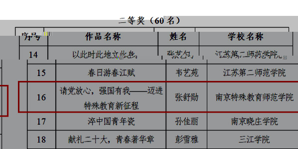 近日,省委教育工委、省教育廳發文公布“奮進新征程,青春勇擔當”全省大學生征文及演講比賽結果。我院選送的張舒勳同學作品《請黨放心,強國有我——邁進特殊教育新征程》榮獲征文比賽二等獎。