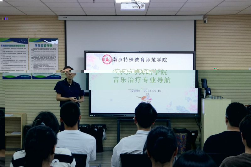 音樂治療系主任段冀州與新生班主任張敏讷,帶領同學們參觀實訓大樓音樂治療室。段主任就本專業的師資力量、專業建設情況、課程結構、培養目标進行介紹與講解,并對大家的問題進行了耐心解答;段主任希望同學們要有奉獻精神、熱愛音樂治療,熟悉音樂治療基礎且能掌握音樂治療各流派。